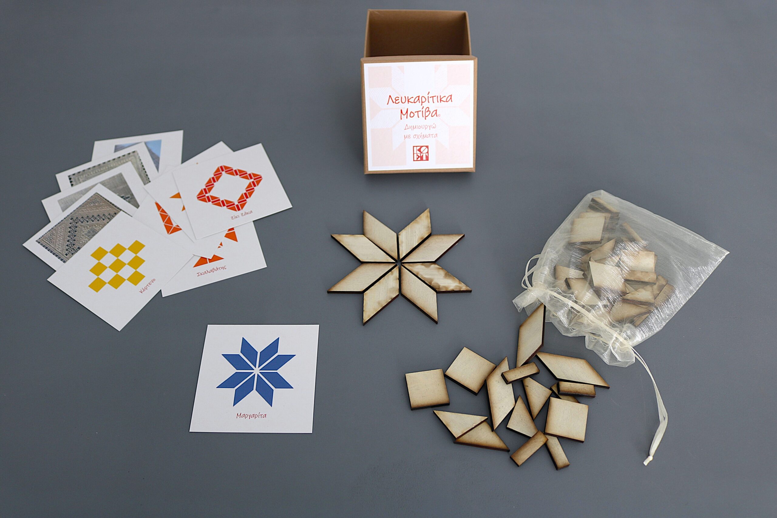 «Λευκαρίτικα Μοτίβα»: Δημιουργικό παιχνίδι με ξύλινα γεωμετρικά σχήματα, τα οποία μπορούν να χρησιμοποιήσουν τα παιδιά για να σχηματίσουν σχέδια του λευκαρίτικου κεντήματος. Το παιχνίδι περιλαμβάνει σειρά από κάρτες με σχέδια, φωτογραφίες και πληροφορίες για διάφορα από τα σημαντικότερα σχέδια που απαντώνται στα λευκαρίτικα κεντήματα